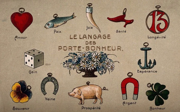 And if the hunchback, pig, mushroom, ladybird or chimney sweep do not appeal, there are more options still on this postcard: Le Langage des Porte-Bonheur, the language of lucky charms.
