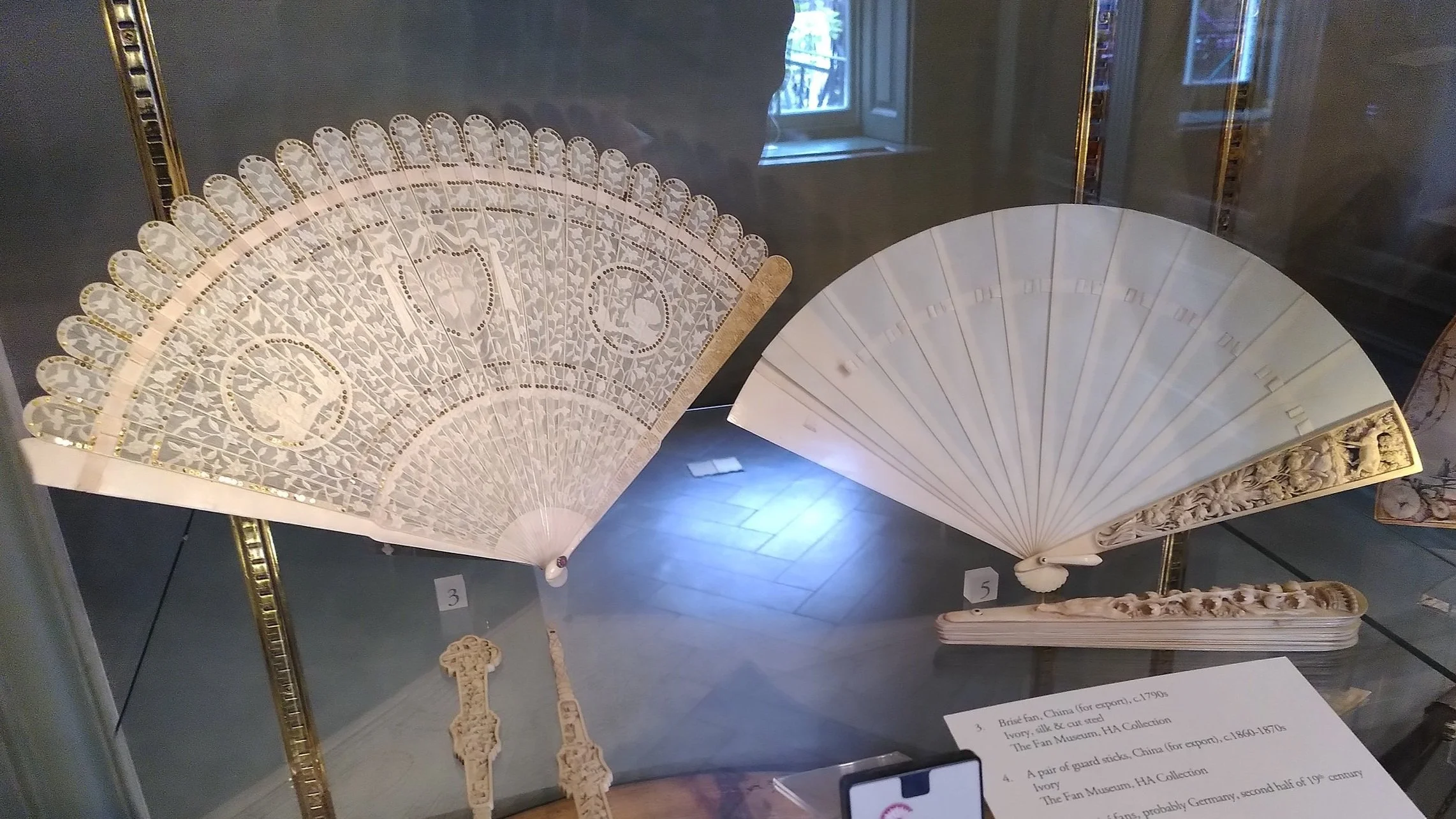 The fan on the left is a brisé fan with leaves made from ivory held together by a steel pin. A silk ribbon runs through the leaves to hold them together. It was made in China in the 1790s but intended for the foreign market.
